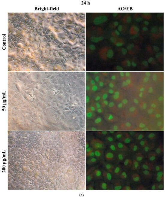 We examined the effects of SiO2/TiO2-embedded gum arabic on human mesenchymal stem cells using bright-field and fluorescent microscopes [39]. The 24-well plate was seeded with approximately 1 × 105 cells per well. After reaching 80% confluence, the cells were incubated with various SiO2/TiO2-embedded gum arabic concentrations for 24 and 48 h. A bright-field microscope was used to examine the cellular morphology after incubation, and photographs were taken. Fluorescent microscopic analysis of the cells was performed by staining them with acridine orange/ethidium bromide (AO/EB), examining them under a microscope, and capturing pictures.