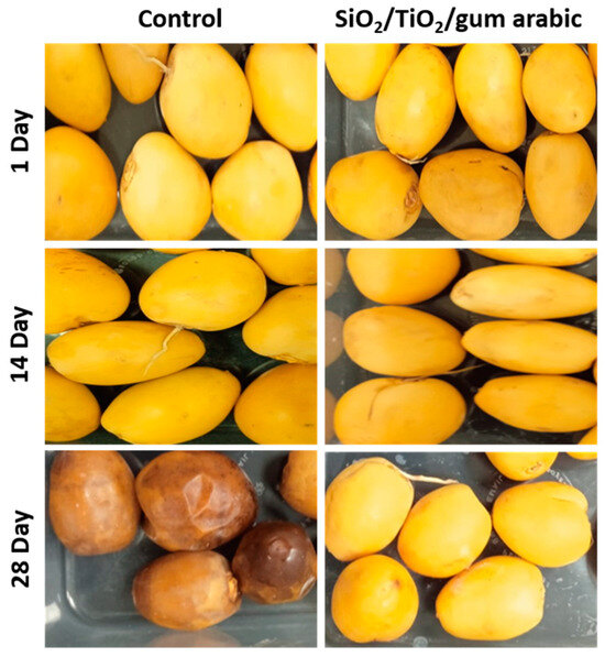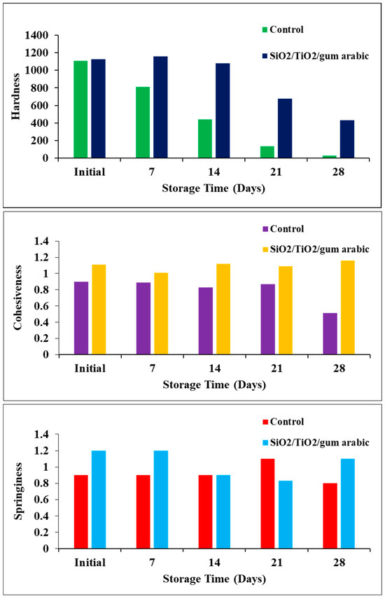 A fruit’s texture is also a crucial aspect that contributes to its freshness and quality. Several factors can affect fruit texture, including moisture content, chemical composition, and the ripening stage. According to the texture study, the control sample’s hardness decreased significantly over time in coated and uncoated dates (Figure 9). Meanwhile, the SiO2/TiO2/gum arabic-coated dates have higher hardness than the control dates. Additionally, cohesiveness and springiness were evaluated in this study. Coated dates had slightly improved cohesiveness and springiness. Earlier studies reported that different biopolymers, including guar gum, gelatin, and chitosan-based edible coatings, extend Barhi date fruit freshness [18]. Furthermore, soy protein, zein, thyme oil, aniseed oil, pea starch, and carnauba wax were used as edible coatings [26,27,28]. Based on our findings, we found that SiO2/TiO2/gum arabic nanocomposite coatings extended the shelf life of dates. The rate of senescence and ripening process may increase during storage, which leads to a loss of hardness (Figure 10). Hence, based on this significance, future studies will measure the chemical composition and enzyme activity using different coating formulations containing SiO2/TiO2/gum arabic.