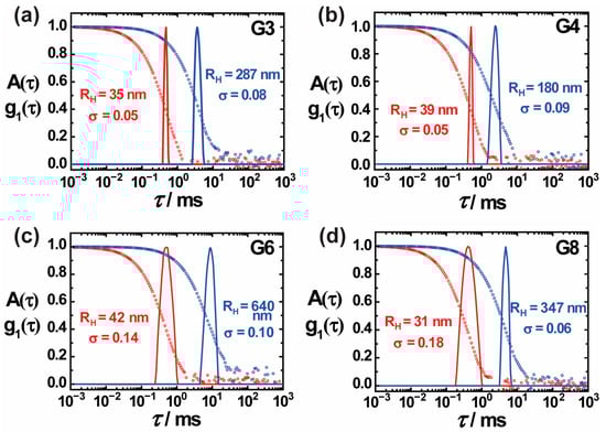 Figure 1. Multi-angle DLS at a charge ratio (dye charges/dendrimer charges) of lc = 1.5 before (red) and after irradiation (blue): electric field autocorrelation g1(τ) (open circular symbols) and distribution of relaxation times A(τ) (lines) at a scattering angle of θ = 90° for different dendrimer generations: (a) G3, (b) G4, (c) G6, and (d) G8. (The RH values were obtained by extrapolation to a 0° angle, and σ represents the particle size distribution at a 90° scattering angle, cAY38 = 1 × 10−4 mol L−1.)