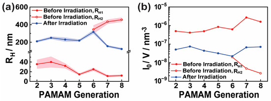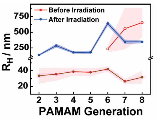 Figure 2. Effect of the irradiation on the hydrodynamic radius RH for various dendrimer generations at a charge ratio of lc = 1.5 and constant dendrimer mass concentration. Results are from multi-angle DLS. The shaded areas in blue and red color represent the polydispersity in particle size Three open-circle data points in red represent a second size species in particles for samples with high-generation dendrimers.