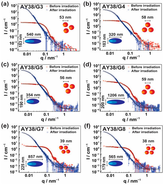Figure 4. SLS-SANS particle shape analysis: (a) AY38-G3; (b) AY38-G4, (c) AY38-G5, (d) AY38-G6; (e) AY38-G7, and (f) AY38-G8, before (red) and after (blue) irradiation at lc = 1.5, with data points (symbols) and structural fits (lines). The inserts indicate the particle structures resulting from the structural fitting. Detailed parameters are given in Table S2.