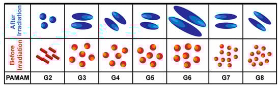 At the ILL, the irradiated samples with different PAMAM generations (G2 to G8) were measured. For this, a particular setup was used, where the employed neutron beam had a diameter of 15 mm. A neutron wavelength λ = 6.0 Å (FWHM 9%) with three different sample–detector distances (1.4 m, 8 m, and 38 m) with collimation distances of 8 m, 8 m, and 40.5 m were used, respectively. In total, a scattering vector range of 0.016 nm−1q ≤ 4.5 nm−1 was investigated.