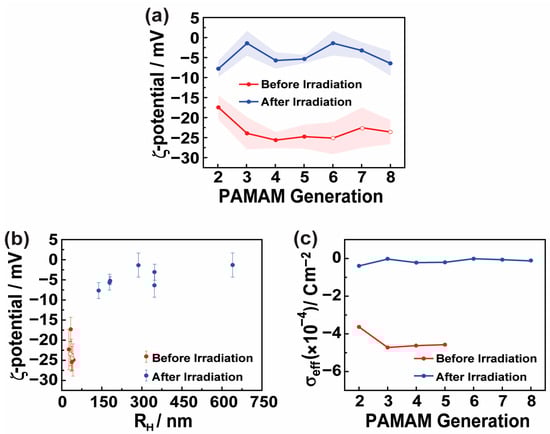 Figure 6. Charge characteristics of dendrimer–dye assemblies: ζ-potential as a function of the (a) dendrimer generation and (b) hydrodynamic radius, RH, before and after irradiation. Open red circles represent the biomodal samples. (c) Effective surface charge density, σeff, of the monomodal assemblies as function of the dendrimer generation. The shaded area in blue and red color in (a) shows the error bar of the ζ-potential values.