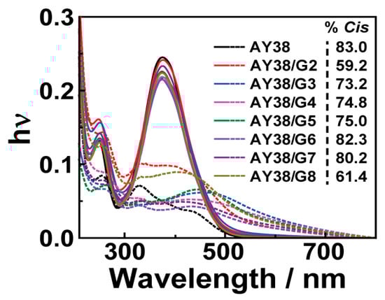 Figure 7. Effect of photoirradiation on dendrimer–dye assemblies at lc = 1.5 as analyzed by UV-vis spectroscopy. Straight lines: data before irradiation; dashed lines: after irradiation. The percentage of cis dye is given in the legend. Each color represents a UV-Vis spectrum of a different dye-dendrimer sample with the dendtrimer generation given in the plot.