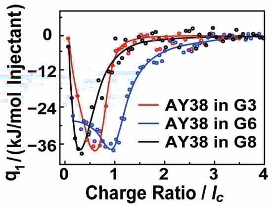 Figure 9. Isothermal titration calorimetry (ITC) to study the thermodynamics of the electrostatic dye–dendrimer assembly formation for varying dendrimer generations: AY38-G3, AY38-G6, and AY38-G8 (where the AY38 dye solution was titrated into the dendrimer solution). Here, q1 represents the energy produced by the system upon titrating per mole of azo dye into the solution and is plotted against the system’s charge ratios. Circles represent data, which were fitted by MicroCal Origin 7.0 software as shown by lines in the respective color.