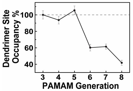 Figure 10. Dendrimer site occupancy of (primary + tertiary) dendrimer amino groups with Acid Yellow 38 dye sulfonate groups as a function of the dendrimer generation. (The value for the G4 PAMAM dendrimer was obtained from Willerich et al. [20].)