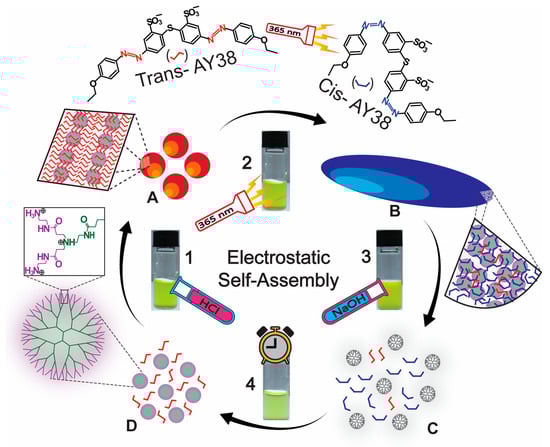 64. Zika, A.; Agarwal, M.; Schweins, R.; Gröhn, F. Joining Two Switches in One Nano-object: Photoacidity and Photoisomerization in Electrostatic Self-assembly. Chem.–A Eur. J. 2022, 29, e202203373. [Google Scholar] [CrossRef] [PubMed]