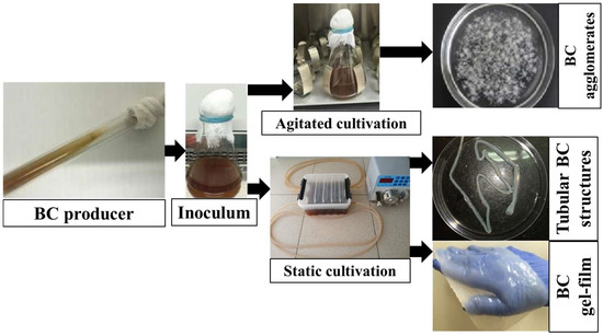 Recently, bacterial cellulose (BC) has attracted the attention of scientists around the world as a biopolymer with unique beneficial properties with wide possibilities of application in various fields, including biomedicine, nanoelectronics, food industry, environmental remediation, etc., [1,2,3,4,5,6,7,8]. Due to the unique properties of BC and its great prospects for use in various fields, particularly in medicine, the issue of cost-effective BC production is currently critical. The main strategies in creating such production are, first of all, the development of cheap nutrient media, the search for highly productive strains of microorganisms, and the optimization of their cultivation conditions [2,9,10,11,12,13]. Thus, many researchers have proposed various industrial and agro-industrial strategies utilizing food waste, including dairy, alcohol, and sugar industry by-products, for cost-effective BC production [14,15,16,17,18,19,20]. A huge amount of molasses is produced worldwide every year, making it an easily accessible resource for cellulose production. Molasses is a by-product of processing sugar cane and sugar beet in sugar production. The cost of molasses is only 1/250 of that of fructose [19], but it is very rich in minerals, organic compounds, and vitamins. Machado et al. (2018) showed the ability of sugarcane molasses to contribute to a significant reduction in the cost of media (up to 20.06%) [20]. BC production is carried out by aerobic fermentation, and unlike other microbial exopolysaccharides, not only under agitated culture conditions but also under static conditions (Figure 1).