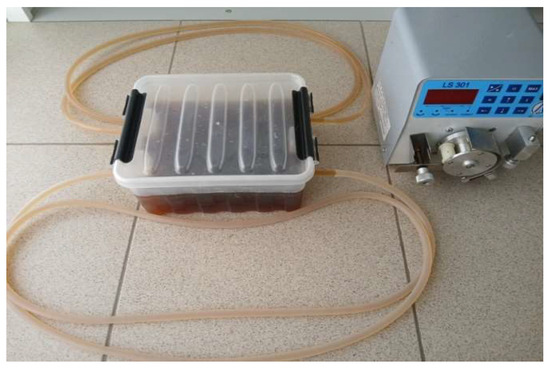 BC tubular structures were produced by fermenting K. sucrofermentans B-11267 in a container with two 200 cm silicone tubes, their internal diameter being 5 mm, using a medium with molasses concentrations of 50 g/L (M50) (Figure 2). The medium was inoculated with 10% (v/v) inoculums obtained by the method described previously [18]. For this purpose, 1350 mL of liquid nutrient medium and 150 mL of inoculum were added to the container under aseptic conditions. Each silicone tube contained 39 mL of culture medium. The K. sucrofermentans B-11267 was cultured for 7 days with double mixing of the nutrient medium in each tube for 10 min on days 1 and 2. A LOIP LS-301 peristaltic dosing pump (LOIP, St. Petersburg, Russia) at a rotor speed of 200 rpm was used for mixing. The liquid flow rate was 53 L/h. At the end of the process, the nutrient medium and the resulting gel film were removed from the container, with 1500 mL of distilled water added. To release the tubular structures from the silicone tubes, a process similar to mixing the medium was carried out, during which the biopolymer was pushed out of the tubes by a stream of water. The resulting structures were processed to remove cells and components of the nutrient medium by the method described previously [18]. Finally, the BC tubular structures were autoclaved at 121 °C for 20 min. Composite tubular structures based on BC and polyvinyl alcohol (PVA) (LabTech, Moscow, Russia, CAS: 9002-89-5, 95.3%) were obtained using the in situ method, by adding 1% PVA to the molasses medium.