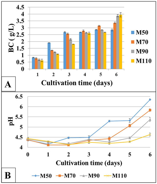 The dynamics of BC production were investigated in the media with different molasses concentrations with an initial pH of 4.5, since the partial hydrolysis of sucrose to glucose and fructose occurred during sterilization. The results are shown in Figure 3A. The highest amount of BC was formed on day 6 of cultivation in M90 and M110 media, and showed a total sugar content of 51 and 59 g/L—3.88 ± 0.08 and 3.95 ± 0.16 g/L, respectively. However, during the first three days of cultivation, the highest amount of polysaccharide was found in the M50 medium, with a total sugar content of 29 g/L (2.68 ± 0.04 g/L on the third day). On day 5 of cultivation, the maximum BC yield was observed in the M70 medium, with a total sugar content of 38 g/L–3.15 g/L. Thus, although the maximum BC yield was observed on day 6 (3.95 ± 0.16 g/L on the M110 medium), cultivation for 3 days on the M50 medium is a good alternative in economic terms, since the cultivation time is reduced in half in this case; on an industrial scale, this could lead to significant savings in costs.