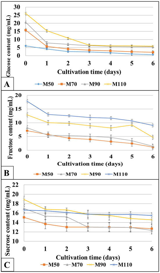 The bacterium K. sucrofermentans B-11267 consumed glucose at the highest rate in all the studied media (Figure 4A). Moreover, the highest glucose consumption was found within the first 3 days of cultivation. Fructose consumption occurred more gradually throughout the cultivation (Figure 4B). Sucrose consumption occurred less intensively (Figure 4C). That is, by the end of the producer cultivation, a significant amount of sucrose remained in the medium. Thus, in all media, the concentration of sugars decreased steadily with time, indicating that K. sucrofermentans B-11267 has the ability to use the carbon sources in these media for BC production. However, in media with different molasses concentrations, glucose was almost completely consumed after 6 days of fermentation (93% in M50 and M70 media, 72–76% in M70 and M110 media), while sucrose consumption was only 6–22%. Fructose consumption was 84–86% in M50 and M70 media, and 24–41% in M90 and M110 media. Since glucose was always consumed preferably by K. sucrofermentans B-11267 [33], it was expected that in sugar beet molasses, after the depletion of glucose, fructose and sucrose would be consumed, respectively. However, in general, it can be concluded that the M50 and M70 media have advantages in economic terms, since they contain a smaller amount of unused sugars by the end of fermentation, and there is the possibility of reducing the cultivation time, since as early as on day 3 in the M50 medium, the BC amount was 2.68 g/L, and in the M70 medium, it was −2.5 g/L. Increasing the molasses concentration in the medium to 90–110 g/L significantly increases the amount of unused sugars.