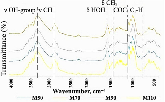Results of FTIR spectra of BC obtained in media with different molasses concentrations.