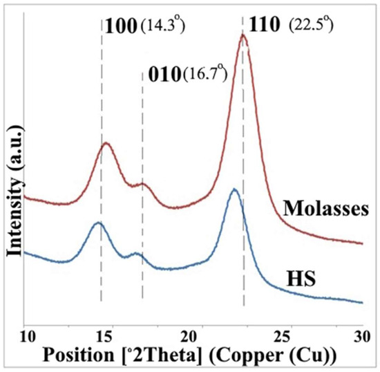 In order to analyze the crystallinity of BC produced from molasses and HS culture media, X-ray diffraction was used. The obtained X-ray patterns demonstrate cellulose with the same chemical structure but different crystallinity degrees (Figure 7). The diffraction diagrams produced by all BC samples show three main peaks at °2Theta 14.3°, 16.7°, and 22.5°, corresponding to crystallographic planes of (100), (010), and (110), respectively. The findings showed that on the medium with molasses, the BC crystallinity degree (83%) was higher than that in the standard HS medium (79%).