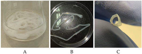 Tubular structures of native BC (A) and BC/PVA composite (B) obtained by culturing K. sucrofermentans B-11267 in a molasses medium after purification. Cross-section of tubular structure (C).