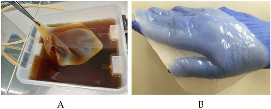 In our study, tubular BC structures were produced by culturing K. sucrofermentans B-11267 in a bioreactor, which represents a container with two 200 cm silicone tubes, 5 mm in their internal diameter (Figure 2), using molasses at a concentration of 50 g/L. The volume of culture liquid in the bioreactor as a whole was 1500 mL, of which 1422 mL was in the container and about 78 mL was in two silicone tubes. The K. sucrofermentans B-11267 was cultured for 7 days, with double mixing of the nutrient medium in each tube for 10 min on days 1 and 2. As a result of the cultivation, two tubular structures were obtained, each 200 cm long (Figure 8A). In addition, a BC gel film formed on the surface of the nutrient medium in the container (Figure 9). The dry BC yield was 0.9 g/L (0.67 g/L for a film and 0.23 g/L for tubular structures). The resulting structures were processed to remove cells and components of the nutrient medium and sterilized. Composite tubular structures based on BC and PVA were also obtained by the in situ method by adding 1% PVA to the molasses medium. Figure 8B demonstrates the resulting structures after purification.