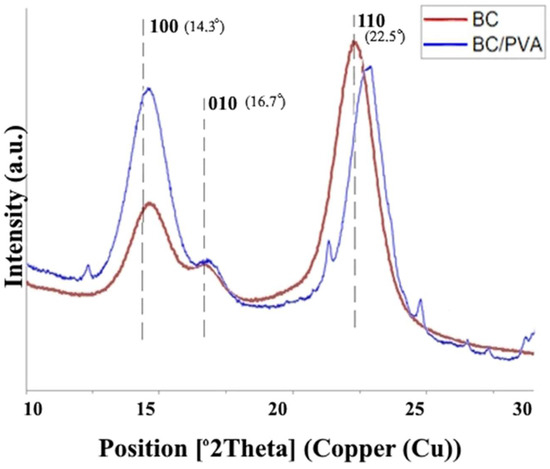 X-ray diffraction was used to evaluate the crystal structure of BC tubes and BC/PVA composite tubes. The obtained X-ray patterns show the cellulose with the same chemical structure but different crystallinity degrees (Figure 11). The findings showed that, on the molasses medium, the crystallinity degree of BC tubular structures (83%) was higher than that of BC/PVA composite (64%).