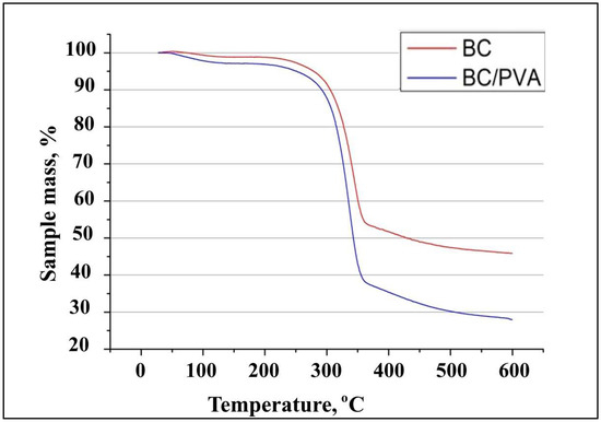 The thermal stability and degradation profile of BC tubular structures and a BC/PVA composite were assessed to evaluate their potential use in high-temperature applications, such as thermal processing, by thermogravimetric (TG) analysis. Figure 12 shows the TG curves of tubular structures from native BC and BC modified with PVA by the in situ method in a molasses medium. The results demonstrated the weight loss of the samples began at 55 °C, and it did not exceed 5% for the native BC sample up to 280 °C and the BC/PVA composite up to 250 °C, which was due to the evaporation of water bound with BC. The native BC sample retained thermal stability up to 305 °C, and the modified PVA sample retained thermal stability up to 290 °C. With a further increase in temperature, the materials were destroyed. At the same time, the native BC sample was more thermally stable, since at 340 °C its weight loss was 30%, while the weight loss of the modified BC sample was 47%.