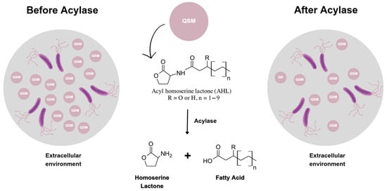 Disruption of quorum sensing in bacteria by acylase. Acylase acts as a QQ agent by cleaving the amide bond in AHLs, the QSM used by Gram-negative bacteria to communicate. By breaking down AHLs in the extracellular environment, acylase prevents these molecules from reaching the threshold concentration needed to activate QS receptors. This inhibition blocks QS-regulated behaviors, such as biofilm formation and virulence factor production, effectively disrupting bacterial communication and reducing infection potential.