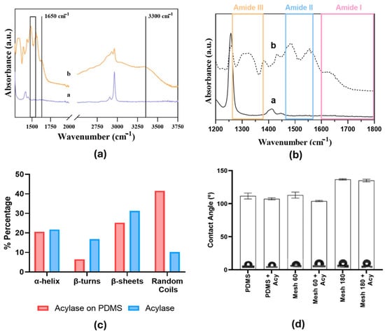 Characterization of the PDMS materials: (a) FTIR-ATR spectra of an untreated sample and b acylase-coated sample, (b) FTIR spectrum of the materials between 1200 cm⁻1 and 1800 cm⁻1, highlighting the amide I, II, and III regions. a, untreated sample and b acylase-coated sample, (c) quantification of secondary structures in the materials based on FTIR spectral analysis. The graph displays the percentages of α-helix, β-turns, β-sheets and random coils present in both samples; (d) surface wettability of PDMS materials before and after treatment (sandblasting and acylase-coating).