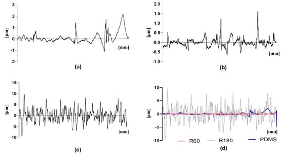 Surface roughness measurements of the materials: (a) PDMS, (b) mesh 60, (c) mesh 180, (d) combined.