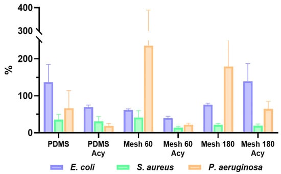 As can be seen in Figure 5, the presence of acylase diminishes the bacterial viability. The acylase coating significantly inhibited the initial attachment of P. aeruginosa CIP after 2 h of contact, as compared to the untreated silicone material. However, acylase does not significantly affect S. aureus, which is in accordance with the literature since acylase is an enzyme that affects the signaling molecules of Gram-negative bacteria. The most significant drop was observed in the mesh 60 sample with P. aeruginosa. The results are in accordance with what is found in the literature, since acylase is a quorum-quenching enzyme responsible for degrading AHLs secreted by Gram-negative bacteria, such as P. aeruginosa [8].