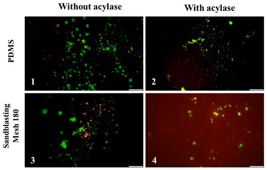Since the roughness of the materials made with sandblasting treatment mesh 60 was not very efficacious, only the mesh 180 and PDMS stripes were used to determine the viability of the bacteria adhering to the surface of these materials. The live/dead assay was employed to evaluate the viability of bacteria following sandblasting treatment and acylase coating treatment. In Figure 6, Live/Dead fluorescent images of E. coli are shown, where green fluorescence represents viable cells, whereas red fluorescent cells have compromised cell membranes. The results revealed a decrease in cell viability in the acylase coating group compared to controls, with a higher percentage of red fluorescence indicating increased cell death. These findings prove that the acylase treatment has a cytotoxic effect on bacteria, which is consistent with the literature [9,37,38,39].