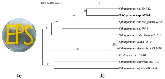 The colonial morphology of MT01 exhibited a yellow, smooth surface and secreted a large amount of sticky substance when grown on sugar plates (Figure 1a). The 16S rDNA sequence of strain MT01 (GenBank accession NO. SRR30104875) showed the highest similarity with Sphingomonas sp. ZKA42 by BLAST alignment analysis (Figure 1b). Therefore, the strain was named Sphingomonas sp. MT01 and deposited in the China Center for Type Culture Collection (CCTCC NO:M20232420).