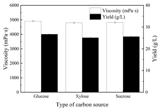 The production of polysaccharide by Sphingomonas species typically used sucrose or glucose as the carbon source. Figure 2 shows the effects of different carbon sources on the production of MT gum. Sphingomonas sp. MT01 was able to efficiently produce MT gum using sucrose, xylose, and glucose, and the apparent viscosity of fermentation broth was 4820 ± 40 mPa·s, 4910 ± 30 mPa·s, and 4800 ± 50 mPa·s, respectively. The polysaccharide yields of all three carbon sources were very close, at around 25–27 g/L. The ability of the MT01 strain to use xylose for polysaccharide production provided the feasibility for using lignocellulosic biomass. Considering that glucose was a relatively cost-effective carbon source, the glucose was finally selected as the carbon source.