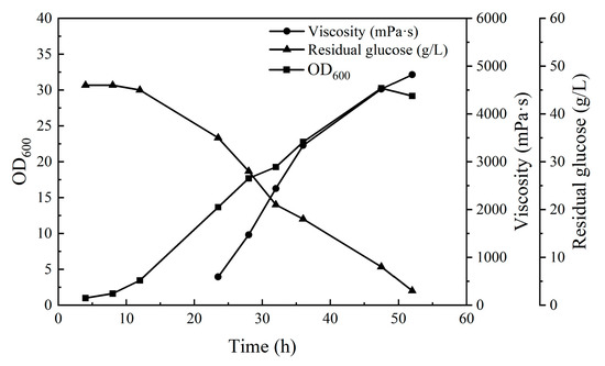 Cell growth was determined by measuring the optical density at 600 nm (OD600). The residual glucose content in the broth was measured using a biosensor equipped with a glucose oxidase electrode (SBA-40C, Shandong Academy of Sciences, Jinan, China). The apparent viscosity of fermentation broth was measured at 25 °C with a rotary viscometer (IKAROTAVISC lo-vi, Staufen, Germany). The suitable diluted broth was incubated at 70 °C for 30 min and then centrifuged at 8000 rpm for 20 min to separate the supernatant and cell pellet. The MT gum in the clear supernatant was obtained by acid precipitation (adjusting the pH of fermentation broth to 2–3 with 6 M HCl) [], and the crude MT gum was dried at 60 °C to constant weight. The dry weight was measured, and the yield of MT gum was calculated as g/L in the broth. The dried MT gum samples were used for rheological properties measurements.