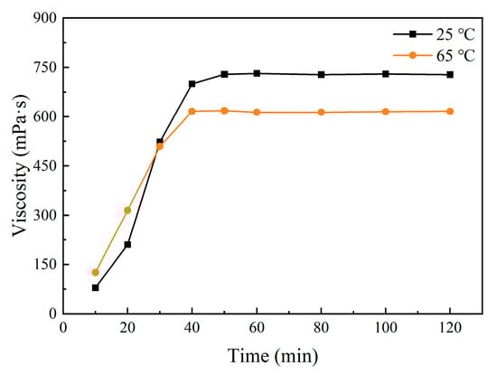 The limited space available on offshore oil platforms makes it challenging to allocate significant quantities of polymers. It is therefore of great significance to study biopolymers with rapid dissolution properties. The MT gum was redissolved at a concentration of 5 g/L with water at room temperature (25 °C) and 65 °C; the dissolution curve is shown in Figure 4. The dissolution equilibrium of 5 g/L MT gum could be reached within a period of 40–50 min at 25 °C and 30–40 min at 65 °C. This indicated that MT gum had instant solubility properties and could complete full swelling within 1 h, which could be effective in reducing the time and space requirements on offshore oil platforms. These results are beneficial for batching on offshore oil production platforms.