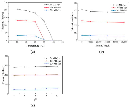 Effects of different factors on the apparent viscosity of MT-Fer solutions. (a) Temperature, (b) salinity, (c) pH. The viscosity was measured at 30 rpm with sp-2 (5×, 10×) and 50 rpm with sp-1 (20×). Values were three replicates.