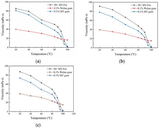 The apparent viscosity of MT gum and welan gum under temperature-salinity composite conditions. (a) 10,000 mg/L salinity; (b) 30,000 mg/L salinity; (c) 50,000 mg/L salinity. The apparent viscosity was measured at 50 rpm with sp-1. Values were three replicates.