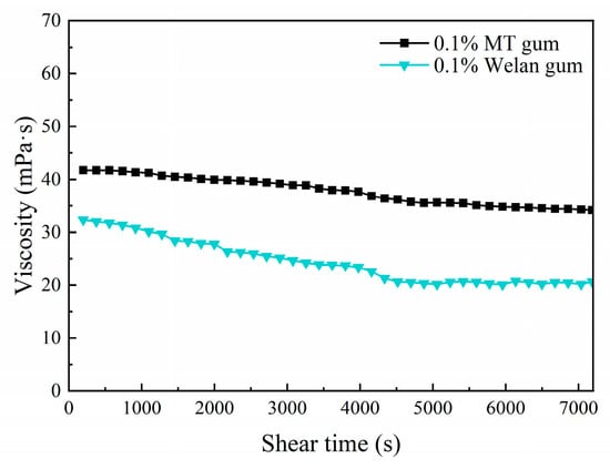 The changes in apparent viscosity of MT and welan solutions (0.1%, w/v) with shear time at 7.34 s−1 under conditions of 80 °C and 50,000 mg/L salinity.