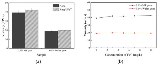 The effects of Fe2+ on the apparent viscosity of MT gum (0.1%, w/v) and welan gum (0.1%, w/v). (a) 3 mg/L Fe2+, (b) Different concentrations of Fe2+ (0, 3, 5, 7, 10, mg/L). The MT gum and welan gum were dissolved in brine water (50,000 mg/L salinity) with or without FeSO4. All solutions were incubated at 80 °C for 10 h, and then the viscosity was measured at 50 rpm with sp-1. Values were three replicates.