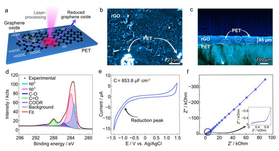 rGO/PET composite electrodes were fabricated by laser processing drop-casted GO films on a PET substrate (Figure 1a). The fabrication protocol and the mechanism behind the composite formation are presented in detail elsewhere [9,15]. Briefly, GO acts as a photothermal transducer during laser irradiation, partially converting light into thermal energy. This energy reduces GO into rGO and partially becomes transferred to the polymer substrate underneath, reducing its viscosity and resulting in rGO intermixing with the liquified polymer due to the Benard–Marangoni convection. This process generates a conductive carbon network encapsulated by the polymer surface.
