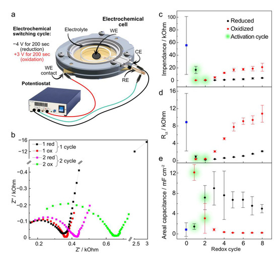 Further electrochemical treatment cycles result in reversible “switching” of the electrochemical properties. Applying the reduction potential led to |Z|0.25 values of ~3 kΩ. In contrast, oxidation potentials caused a constant increase in |Z|0.25 up to the 5th cycle, after which the impedance stabilized around 20 kΩ for all following oxidation treatments (Figure 2c). A similar trend is observed for Rct, with the reduced state stabilizing around 1 kΩ and the oxidized state stabilizing at the 5th cycle with values close to 10 kΩ (Figure 2d). For the areal capacitance, the oxidized state values were 0.5 mF cm−2. In contrast, the reduced state exhibited a one-order-of-magnitude increase (Figure 2e).
