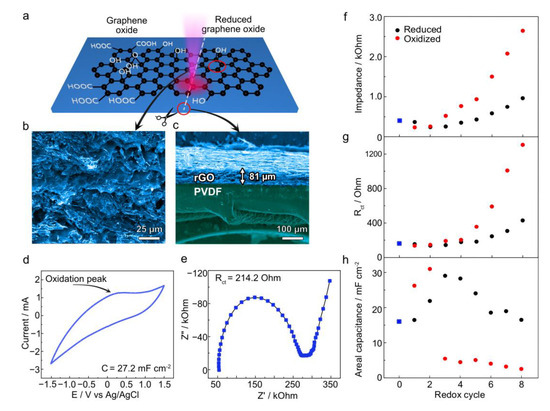 (a) Schematic illustration of the rGO/PVDF preparation via laser treatment with the sample (b) top-view and (c) cross-section obtained by SEM. (d,e) CV and Nyquist plot for the initial untreated sample, respectively. (f–h) Plots of calculated sample figures of merit were obtained from CVs and impedance plots through all the investigated 8 redox cycles: impedance values at 0.25 Hz, charge transfer resistance, and areal capacitance, respectively. The values at the “0” point represent the values for the initial samples, which are also marked with blue squares.