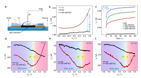 (a) Schematic illustration of the setup for transistor characteristics measurements. (b) Transfer characteristics in DI water and 50 mM KCl liquid gate for 1st red sample at VDS = −0.5 V. (c) Device response at VG = +0.5 V and VDS = −0.5 V corresponds to different KCl molarity for 1st red samples. (d–f) Transfer characteristics in DI water and 50 mM KCl for 1st ox, 3rd ox, and 3rd red samples, respectively.