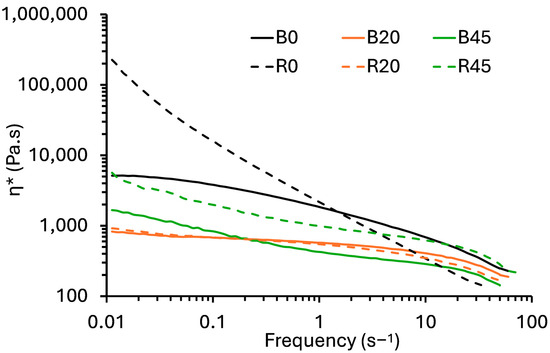 All the polymer melt samples showed non-Newtonian shear thinning behavior (pseudoplastic). Therefore, the data for each formulation were fitted to a power–law model (Equation (2)), and a summary of the model’s parameters (K, n and R2) is given in Table 2. The fitted models showed generally good fits, with R2 > 0.9. In the blended (B0–B45) and crosslinked (R0–R45) series, n values generally increased with lignin content. This suggests that lignin acted as a plasticizer for PBS [41]. The n value for R0 was low (0.118) due to a highly crosslinked polymer network [37]. In contrast, wood–plastic composite melts show a decrease in n with wood content [42]. This plasticization phenomenon was also evident via a decrease in K values with increasing lignin content, except for samples R30 and R45, wherein they increased.