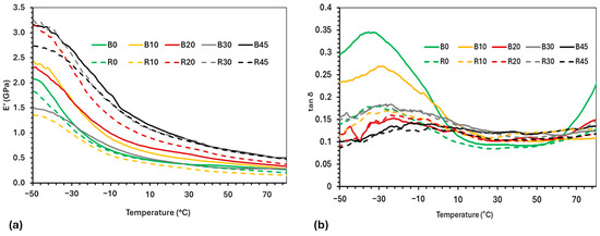 The viscoelastic properties (storage modulus (E′) and tan δ) of the various PBS–lignin formulations were determined by DMA to examine the influence of lignin content and crosslinking (Figure 3 and Table 3). The E′ for all the formulations decreased significantly with temperature due to passing through a glass transition phase (Tg) around −30 °C. For the PBS–lignin blends, B45 had the highest E′ at 3.16 GPa (at −50 °C) compared to PBS at 2.08 GPa, showing that lignin effectively reinforced the polymer matrix [38,43]. Crosslinking PBS (R0) reduced its E′ by 13%; however, the addition of lignin increased E′ to 3.25 GPa (R30). These results highlight the role of DCP-induced crosslinking in enhancing the PBS and lignin network structure [28,44].