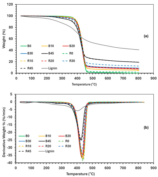 The thermal degradation behaviors of PBS and various lignin–PBS formulations were determined by TGA and differential thermogravimetric (DTG) analysis (Figure 5). It was observed that, after the initial moisture release, the thermal degradation onset (Tonset) of lignin started at 320 °C, which is lower than that of PBS, at 396 °C (Table 5). Cross-linking PBS (R0) did not significantly change its Tonset. The Tonset for lignin was 320 °C. The Tonset values for the PBS–lignin formulations were comparable to PBS, suggesting that lignin did not influence PBS onset [39]. From the DTG curves, the temperatures at the peak maximum (DTGmax) were determined (Table 5). The DTGmax values for lignin and PBS were 407 °C and 437 °C, respectively. For the PBS–lignin formulations, the DTGmax was between 426 and 437 °C. However, the intensity of the DTGmax peak reduced with lignin content, suggesting that lignin can be used to improve the thermal stability of PBS [29,37,50]. Lignin had a residual mass of 40% at 800 °C, and this is lower than those reported by Zhang et al. at 50% [51] and Beis et al. at 44% [52] for kraft lignin. The TGA residual material at 800 °C was shown to increase with lignin content. For example, at 45% lignin, the residual mass was around 18–19%, indicating that lignin contributes to char formation during thermal degradation in N2. This behavior is consistent with the findings that lignin can improve the char yield due to its aromatic structure, which provides thermal stability [37]. DCP addition was not found to have any significant effect on the thermal degradation behavior of the copolymers.