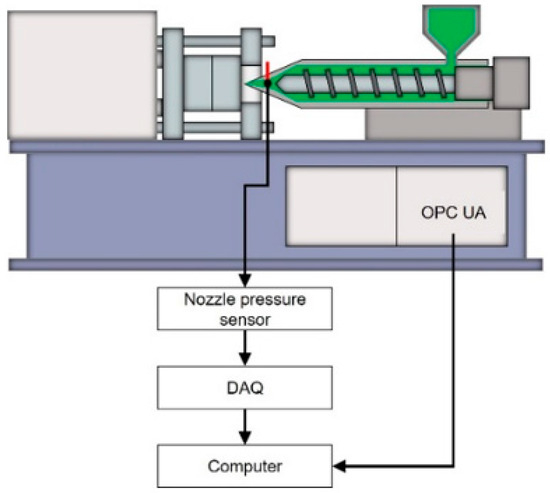 This study involves capturing data from pressure sensors via a DAQ system and retrieving data from in-machine sensors using the OPC UA communication protocol. The architecture of the data acquisition system is shown in Figure 2. This study utilizes a pressure sensor produced by Dynisco (Franklin, MA, USA), model PT4656XL-30M, which has a pressure measurement range of 0–30,000 psi and can withstand temperatures of up to 400 °C. The DAQ used is from Advantech Co., Ltd. (Taipei, Taiwan), model USB-4716, with a maximum sampling rate of 200 kHz.
