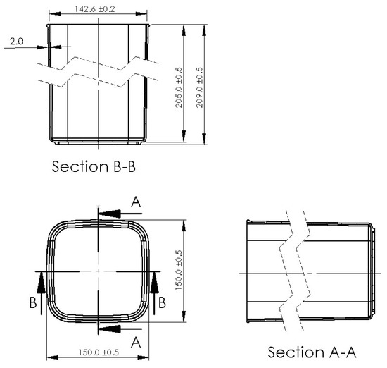 This study uses a single-cavity cold runner mold produced by Felli Co., Ltd. (Tainan, Taiwan) for both experiments and simulations, primarily utilizing a sprue gate for filling. Measurements focus on the product’s inner diameter, which has a specified dimension of 142.4 mm. The model in this study includes the mold, cooling channels, runner, part, and nozzle area, with dimensions shown in Figure 3, Figure 4 and Figure 5.