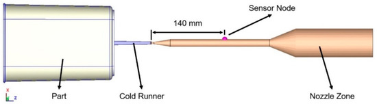 In this study, the sensor nodes are positioned 140 mm from the sprue point to record the pressure history at the nozzle end, as shown in Figure 6.