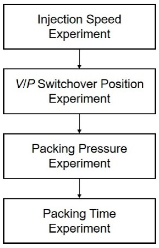 In the scientific process parameter setup, parameters from later stages have less impact on earlier stages. Therefore, this study defines the scientific process parameter setup flow based on the sequential order of stages in the injection-molding process. Injection speed, which affects viscosity and subsequently the quality of the filling stage, is the first parameter to be selected. The V/P switchover position, which influences the material volume during injection, is chosen next. Both packing pressure and packing time significantly impact the results of the packing stage. While packing time is often determined by the gate solidification time, packing pressure affects this solidification time. Thus, packing pressure is selected first, followed by the determination of the appropriate packing time. The process parameter search flow is shown in Figure 7.