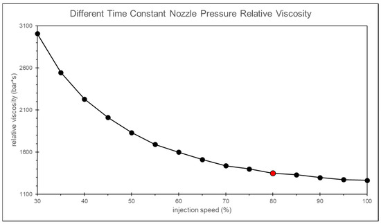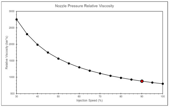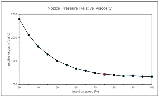 By calculating the relative viscosity using the nozzle peak pressure and the timing of the peak pressure, and applying the convergence criterion, the most appropriate injection speed is found to be 75% of the maximum injection speed, as shown in Figure 9.