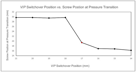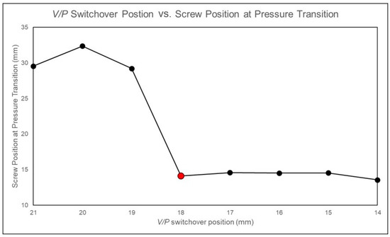 Experimental screw positions for fully filling the cavity identified at different V/P switchover positions.
