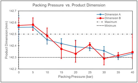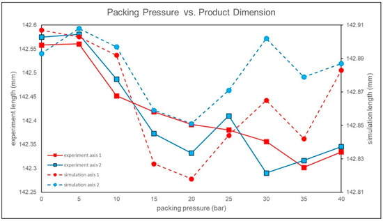 The specified dimension of the product in this study is 142.4 mm. When the packing pressure is set to 25 bar, the product dimensions are closest to the specified dimensions, as shown in Figure 12. This parameter setting provides a larger molding window, indicating that a packing pressure of 25 bar is the close to the optimal process parameter.