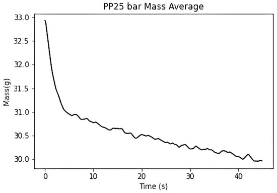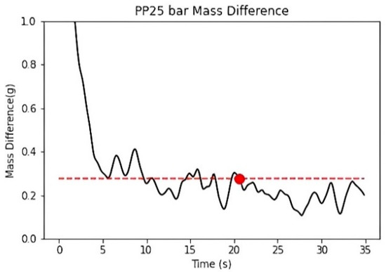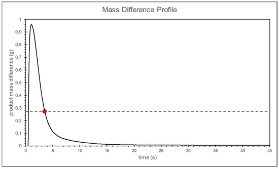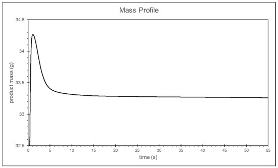 The duration of the packing pressure stage is often determined by the gate solidification time. Once the gate solidifies, the melt can no longer continue filling the cavity. Assuming no material leakage occurs at the check valve, it can be inferred that the melt mass difference at the front end of the screw will show a converging trend. Therefore, in this study, the temperature and pressure at the machine nozzle are applied to the material’s P–V–T model to calculate the specific volume. The screw front volume is obtained by multiplying the screw position by the cross-sectional area and then dividing the screw front volume by the material’s specific volume to calculate the melt mass at the front end of the screw, as shown in Figure 13.