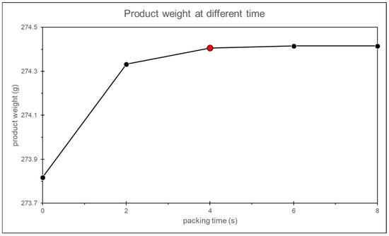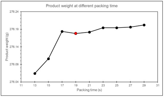 In this study, it is observed that when the packing time is set to 19 s, the product weight exhibits a converging trend, confirming the feasibility of this method, as shown in Figure 15.